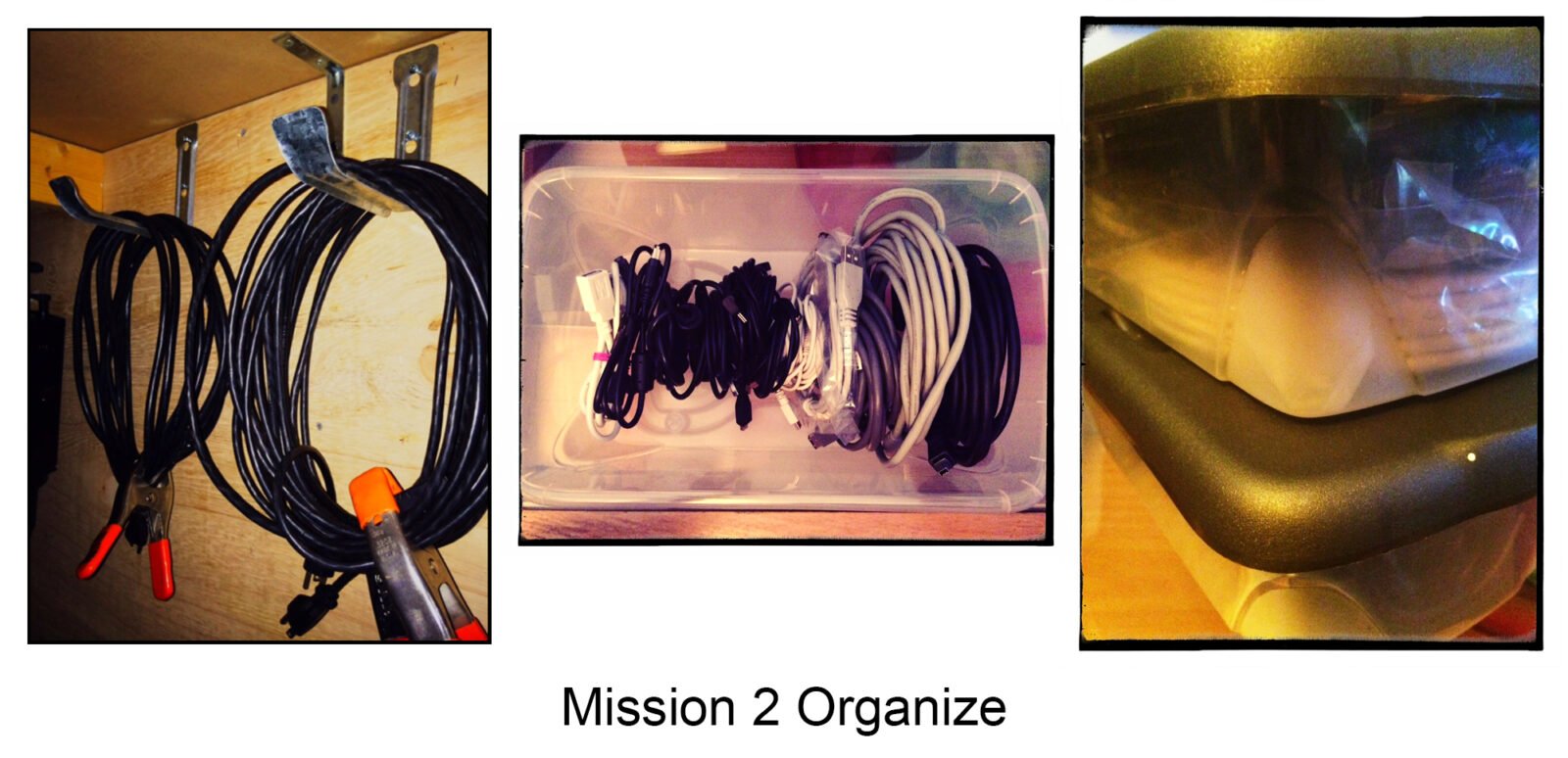 Now that you have sorted, purged, paired and labeled your cords, use containers or boxes to store away the ones you are not using daily. Use smaller containers for thinner and shorter cords. Bigger containers can be used to store bulky wires like power cords. You can also think vertical. Sometimes the best place to store long wires that you need access to is to use hooks or pegboard on the wall or inside utility closets. Label the containers for easy access.