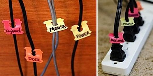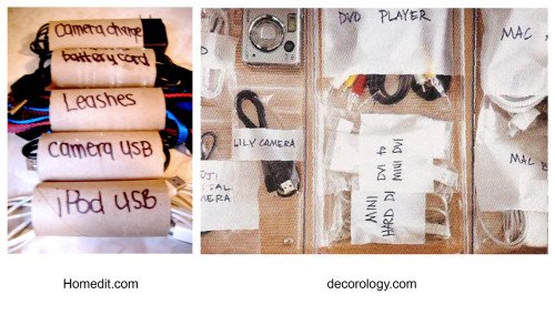 First collect all your cords and start sorting them by category such as chargers, extension cords, power strips and so on. Now it’s time to purge! Match each charger with the appropriate device. Get rid of broken, outdated or unidentified wires. There are some labeling options out there to pair and keep track of your wires. Here are 3 simple and free do-it-yourself projects to identify, sort or store your cords.